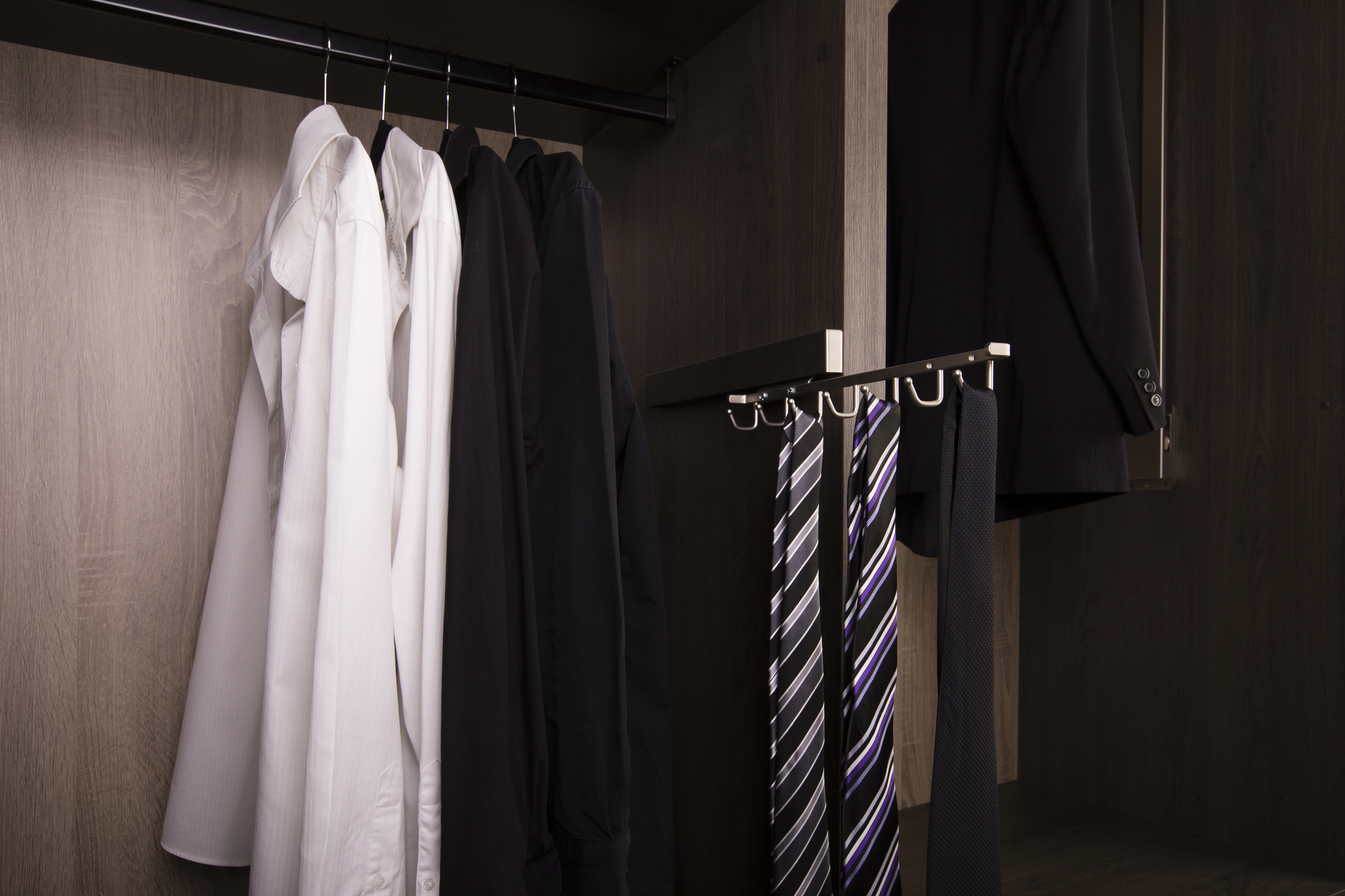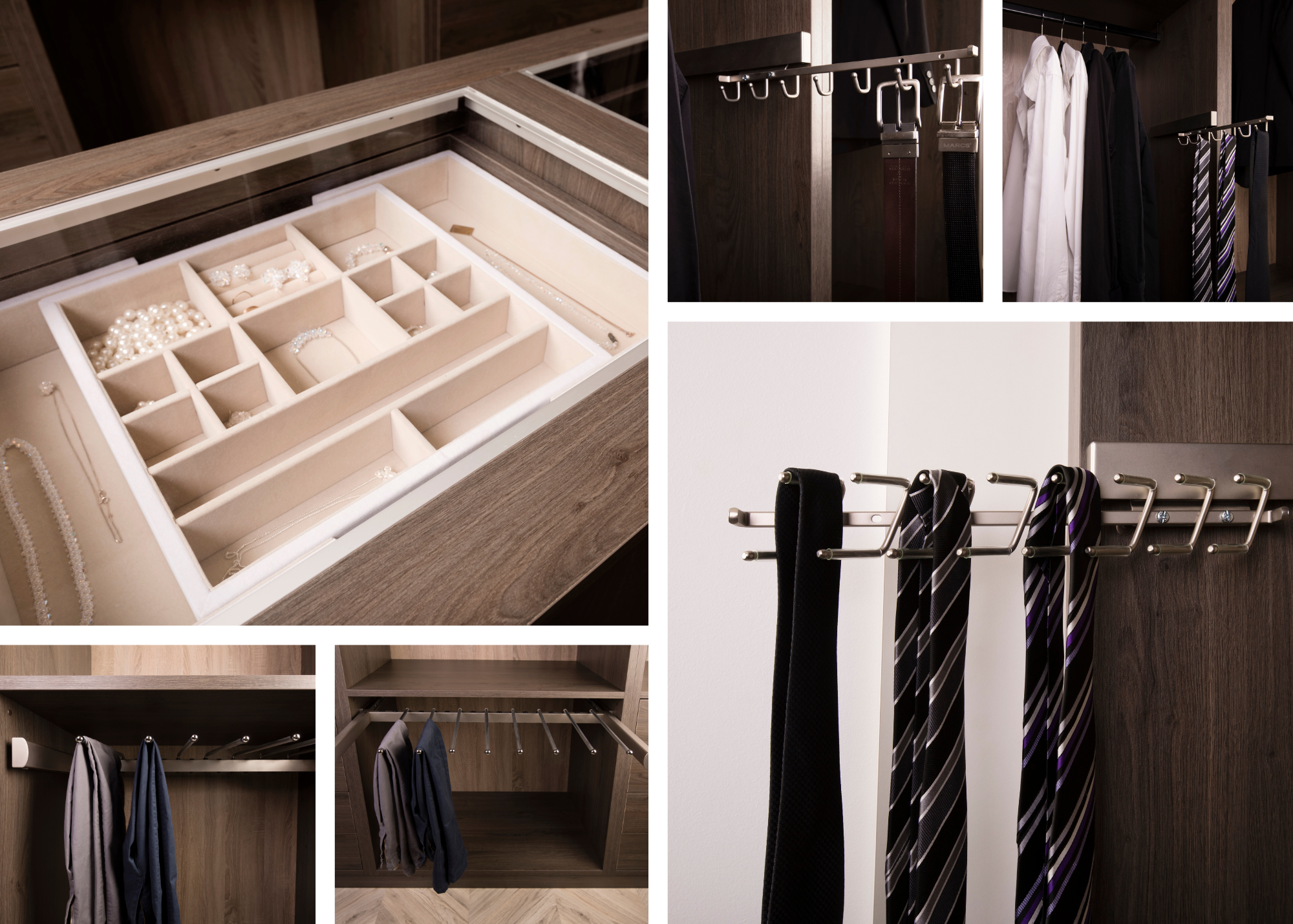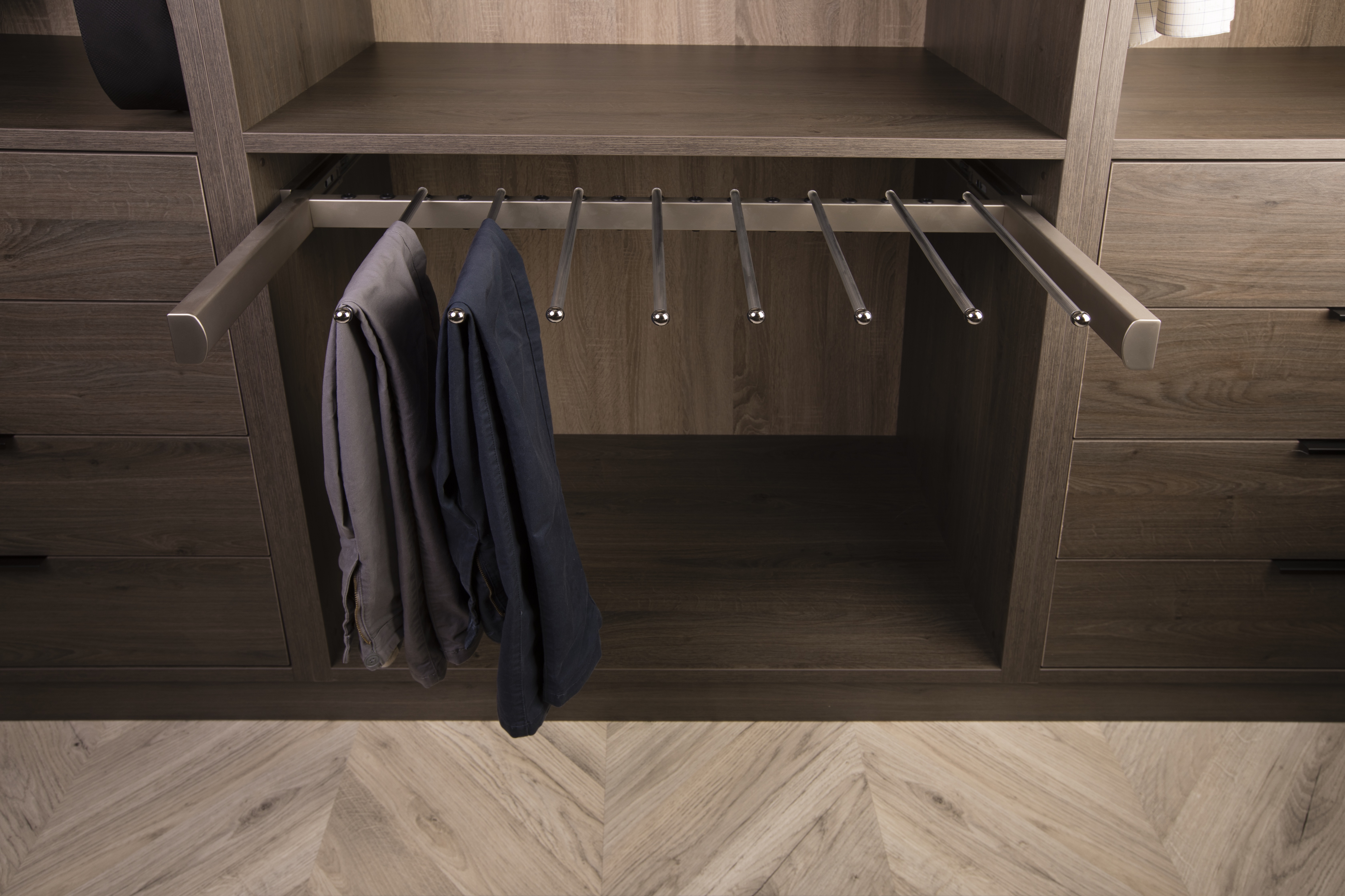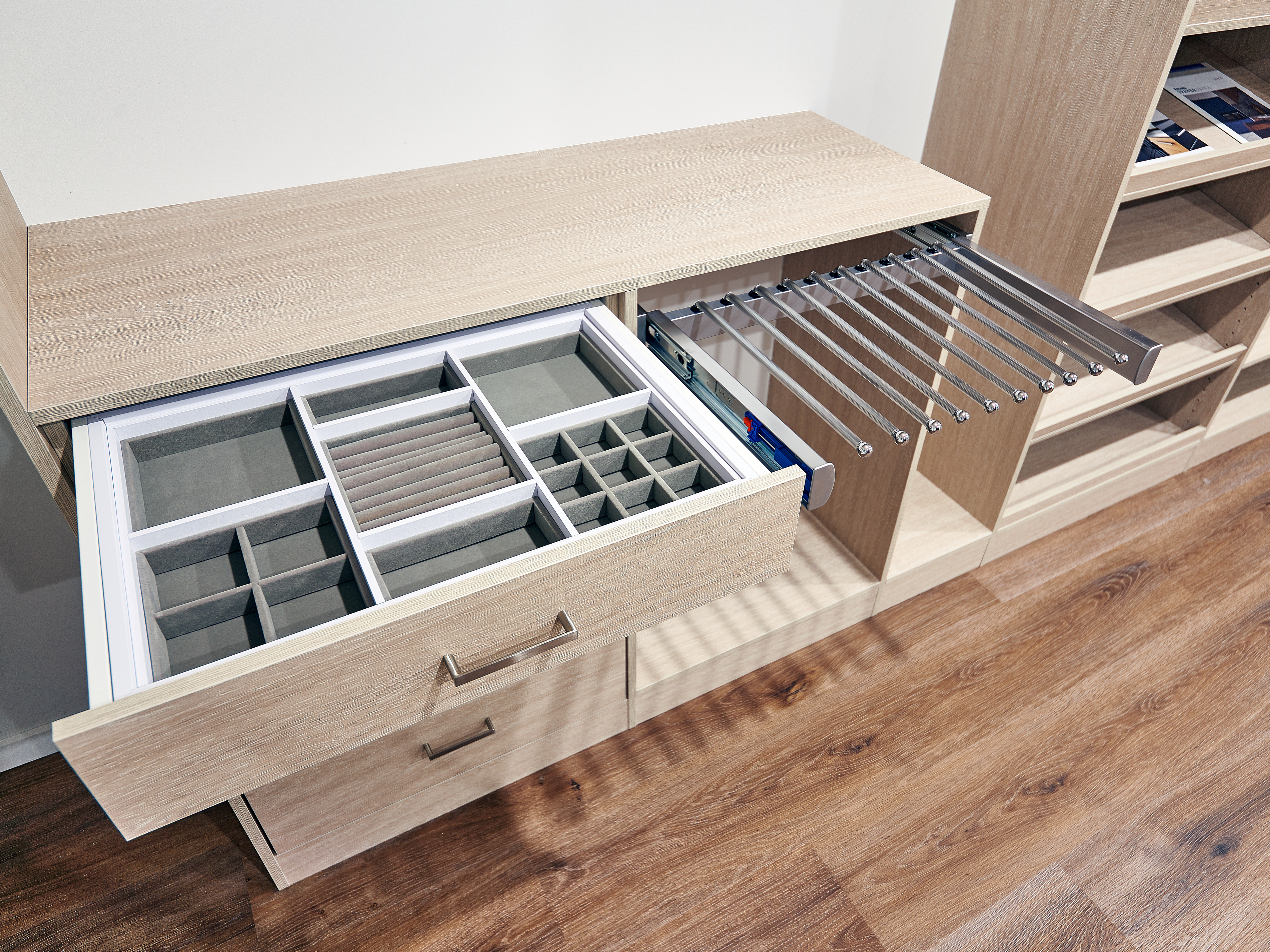 Choose from a variety of options including Jewellery Tray Inserts, Deluxe Sliding Belt and Tie Racks, and Soft-Close Pants or Trouser Racks to match your wardrobe style and functionality requirements.